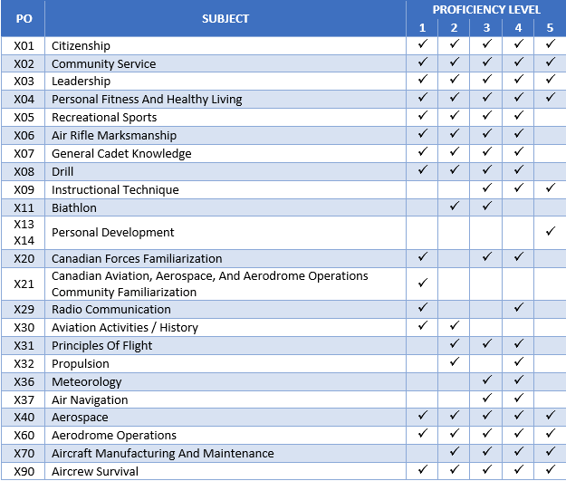 The following table shows all of the subjects currently covered in the Air Cadet Program curriculum and in which proficiency level they are taught:
